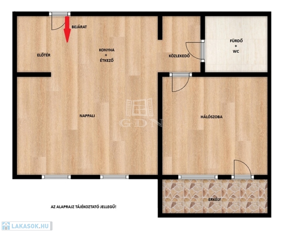 Ingatlan elosztása: nappali+konyha (23,7 m2), hálószoba (12,7 m2), fürdő+wc (3,6 m2), közlekedő (2 m2), erkély (4 m2)