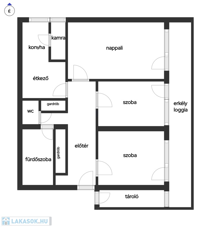 Lakás jellemzői: nappali szoba 18,09 nm, dolgozószoba 12,24 nm, hálószoba 10,27 nm, fürdőszoba wc-vel 5,74 nm, külön wc 1,24 nm, konyha, étkező egyben 10,71 nm, kamra 1,59 nm, előszoba 8,92 nm, beépített gardrób 2,08 nm, tároló 4,4 nm, erkély 13,22 nm, alagsori garázs 15,87 nm.
