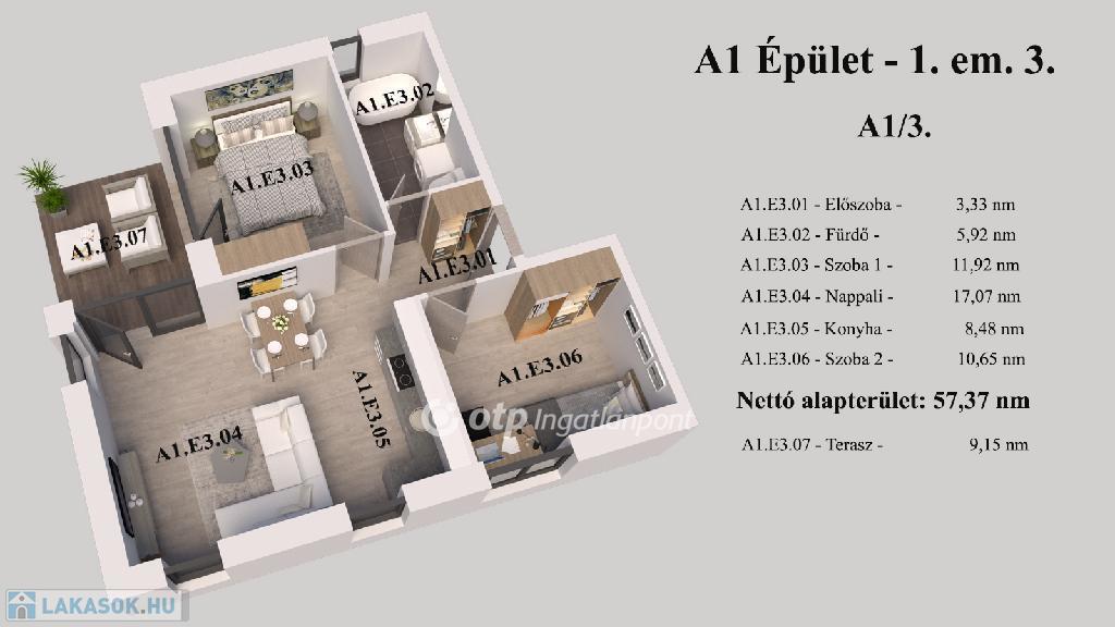 Eladó újépítésű I. emeleti  lakás a siófoki Karma Garden projektben! Siófok egyik legújabb és legmodernebb lakóparkjában, a Karma Gardenben, eladó egy 3 szobás, 57,37 nm-es I. emeleti lakás, amely ideális választás mind állandó otthonnak, mind nyaralónak. Főbb jellemzők: Alapterület: 57,37 nm Helyiségek: nappali + 2 hálószoba + konyha, étkező + fürdő. Saját terasszal, ami  9,15 nm. Kültéri parkolóhely az ingatlanhoz tartozóan Modern kialakítás, prémium anyaghasználat Kiváló elhelyezkedés, közel a Balatonhoz és a városközponthoz Ne hagyja ki ezt a remek lehetőséget, élvezze a balatoni életérzést saját kertjében! Ár és további információ: Hívjon bizalommal vagy írjon üzenetet!