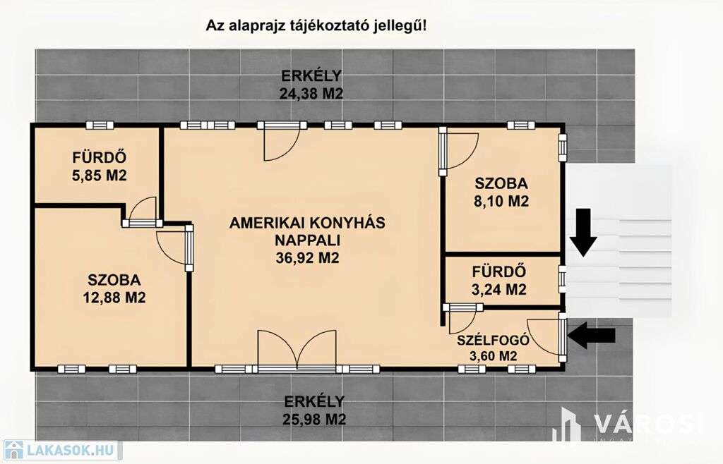 A 37 m²-es amerikai konyhás nappali tágas és világos, tökéletes közösségi tér. A két különálló hálószoba biztosítja a privát szférát. Két fürdőszobával rendelkezik, ami kényelmes mind családok, mind vendégek számára.
