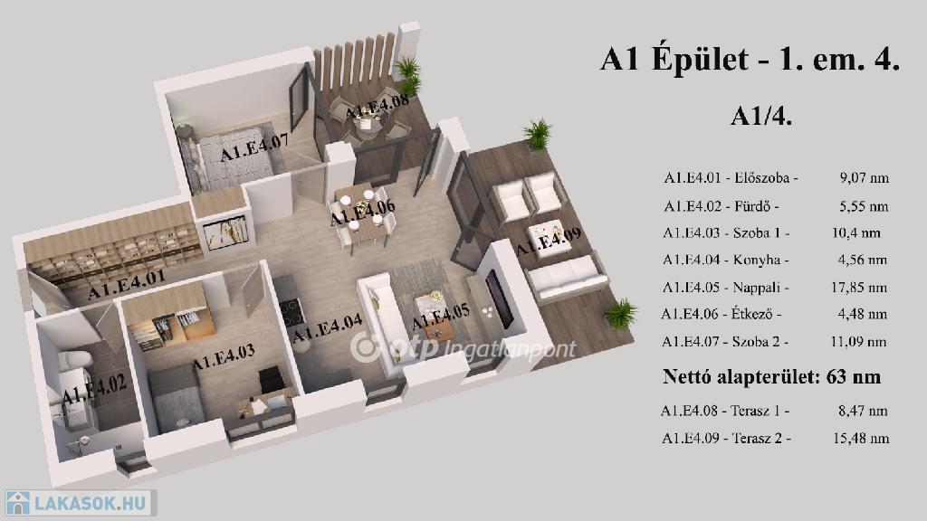 Eladó újépítésű földszinti lakás a siófoki Karma Garden projektben! Siófok egyik legújabb és legmodernebb lakóparkjában, a Karma Gardenben, eladó egy 3 szobás, 63 nm-es I. emeleti lakás, amely ideális választás mind állandó otthonnak, mind nyaralónak. Főbb jellemzők: Alapterület: 63 nm Helyiségek: nappali + 2 hálószoba + konyha, étkező, fürdőszoba. 2 tágas terasz, amely tökéletes pihenésre. Kültéri parkolóhely az ingatlanhoz tartozóan Modern kialakítás, prémium anyaghasználat Kiváló elhelyezkedés, közel a Balatonhoz és a városközponthoz Ne hagyja ki ezt a remek lehetőséget, élvezze a balatoni életérzést saját kertjében! Ár és további információ: Hívjon bizalommal vagy írjon üzenetet!