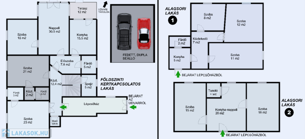 A lakáshoz tartozik még 2 külön bejárattal, külön mérőkkel szerelt szuterén lakás, mely szintén a társasház zárt lépcsőházán keresztül közelíthető meg. Ezek az elmúlt években szintén fel lettek újítva, száraz falak, nincs dohosodás.