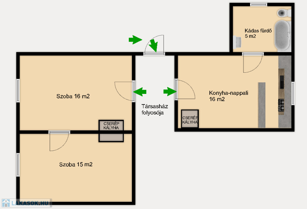 A nagyobb, 31 m2-es lakásrészben pedig 2 egymásból nyíló hálószoba került kialakításra, egy nagyméretű cserépkályhával.