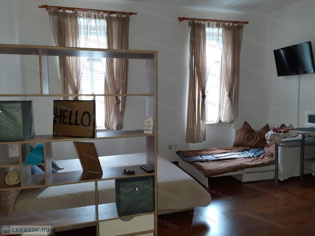 Kettő az egyben!Két első emeleti kis lakás, Sopron belvárosához közel eső részen, egy helyrajzi számon eladó.A két lakás összesen 68 m2 és egy közös használatú előtér választja ketté. Mindkét lakás amerikai konyhás-hálóteres kialakítású, a fürdőszoba WC-vel közös helyiségben kialakított. A belmagasság (3,2 m) ellenére nagyon kicsi a fűtésszámla, ami részben a vastag falaknak köszönhető. A polgári jelleg nemcsak költséghatékonysága miatt, atmoszférájában is az ingatlan vonzerejét erősíti. Jelenlegi tulajdonosa airbnb-re hasznosította, mely tartós bevételi forrást biztosított számára, költözés miatt viszont most kénytelen megválni a lakásoktól. A teljes bútorzat a vételár része.A lakáshoz tartozik egy kis méretű tároló és egy padlásrész mely az első, utcafronti lakásrész felett található- Igy lehetőség nyílik az ingatlan esetleges bővítésre is.A társasház 6 lakással rendelkezik, jelentós megtakarítással rendelkezik mely a jövőben tervezett felújításokat fedezi.Az udvar fel lett osztva a lakások között, így ehhez az ingatlanhoz is tartozik egy kb. 35 m2 nagyságú kis kertrész, ami saját célra alakítható. Rövid időn belül birtokba vehető.A belváros csak egy séta, mégis nyugodt környék.