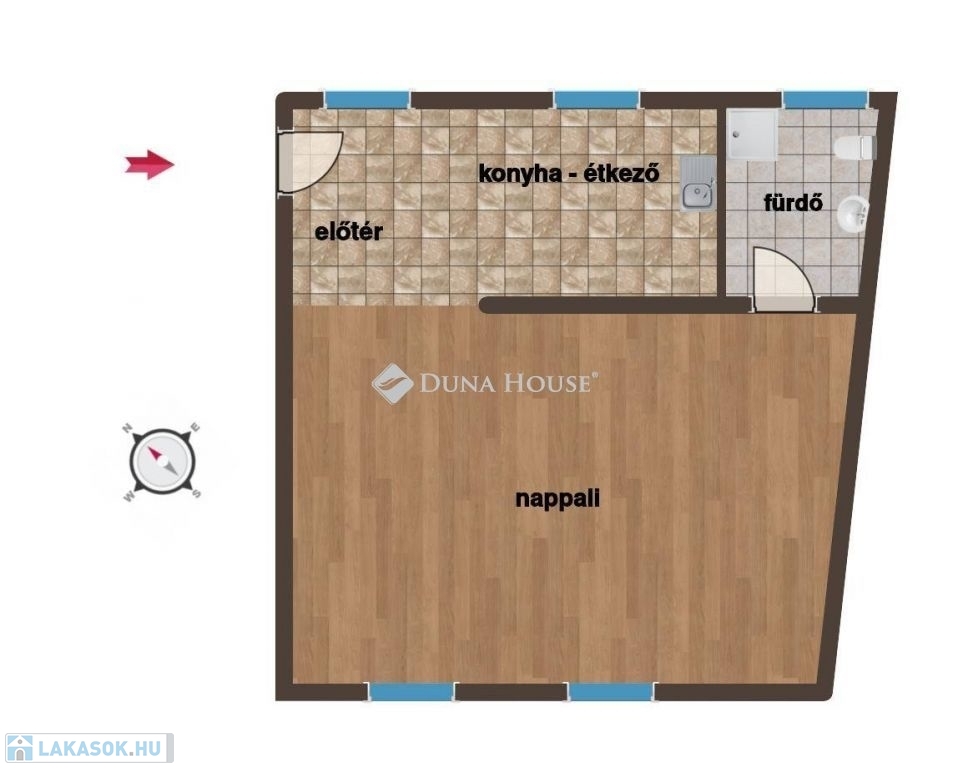A2 lakás: A földszinti ingatlan 49 m2 alapterületű, előtér, nappali, konyha-étkező és fürdőszoba kapott helyet benne, a nappali mérete és belmagassága lehetővé teszi galéria kialakítását.