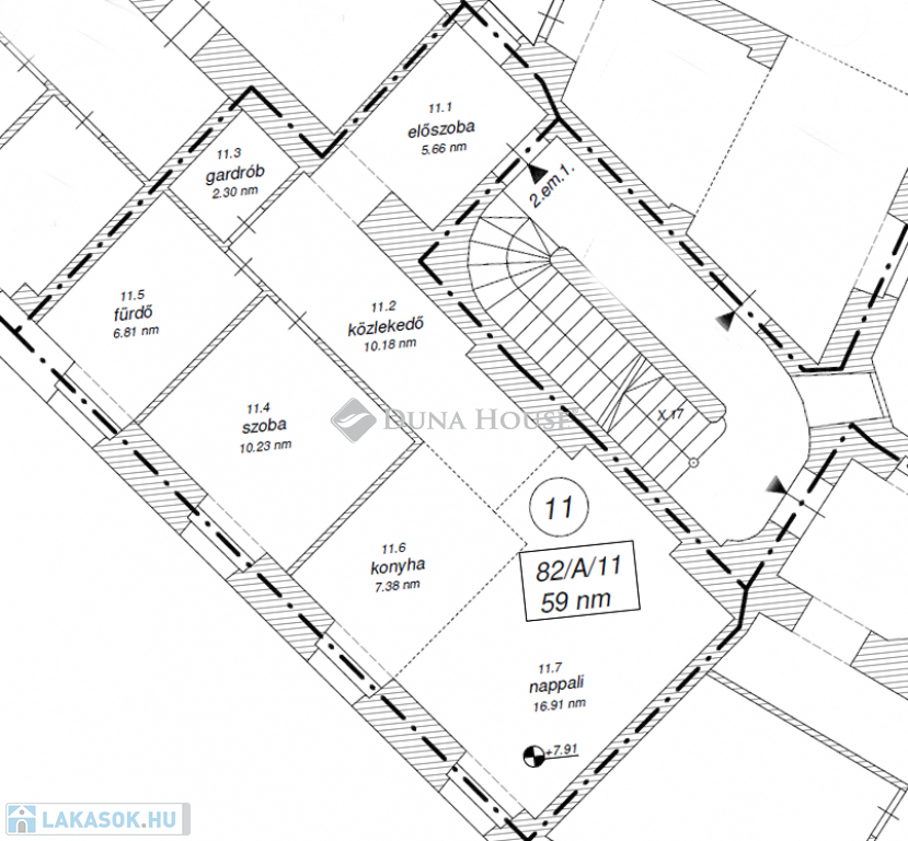 A 11 lakás: A második emeleti ingatlan 59 m2 alapterületű, amerikai konyhás nappali, egy hálószoba, gardrób és fürdőszoba kapott helyet benne, a hangulatos lakás tágas, világos, délnyugati tájolású, kilátással a sétáló utcára...