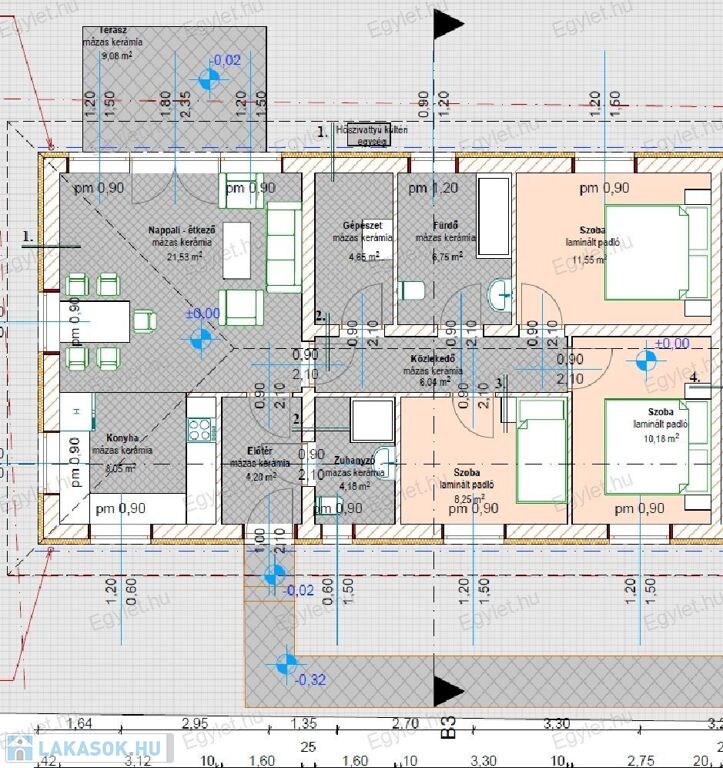 1. lakás: 85,20 m2 + terasz 9 m2 + 143 m2 saját használatú telek terület = 99.990.000 Ft