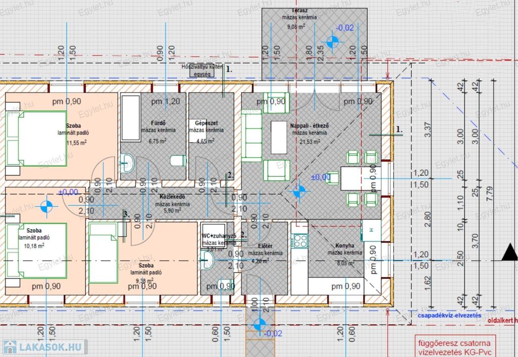 1. lakás: 94,4 m2 + terasz 9 m2 + 138 m2 saját használatú telek terület = 113.750.000 Ft