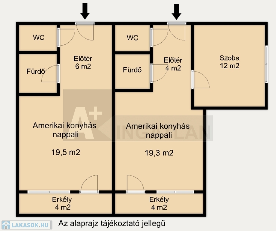 - 42 m²-es apartman: amerikai konyhás nappali + hálószoba, külön fürdő és WC+ erkély
