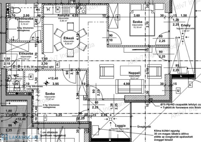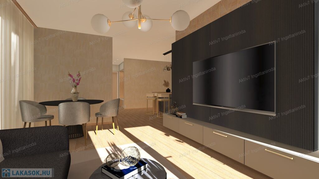 A szóban forgó lakás negyedik emeleti, 63,48 m2 területű, amerikai konyha nappali +2 hálószobás, a hozzá tartozó 7,64 és 6,23 m2 erkélyekkel (a fotók között található alaprajz szerint).
