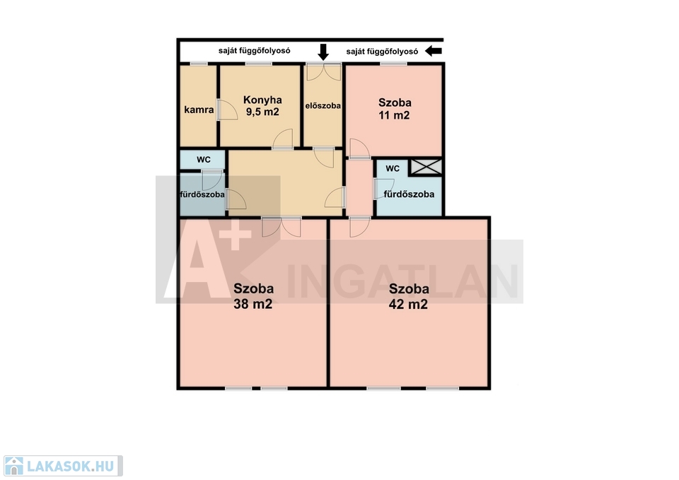 A 3 nagyméretű szoba praktikusan külön bejáratú. A lakásban 2 fürdőszoba is rendelkezésre áll, az egyik kádas, a másik zuhanyzós kialakítással.