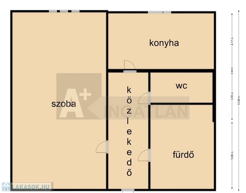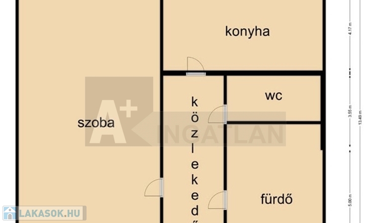 A lakás elrendezése :egy nagy szoba ,kényelmes méretű konyha ,külön fürdőszoba ,wc.
