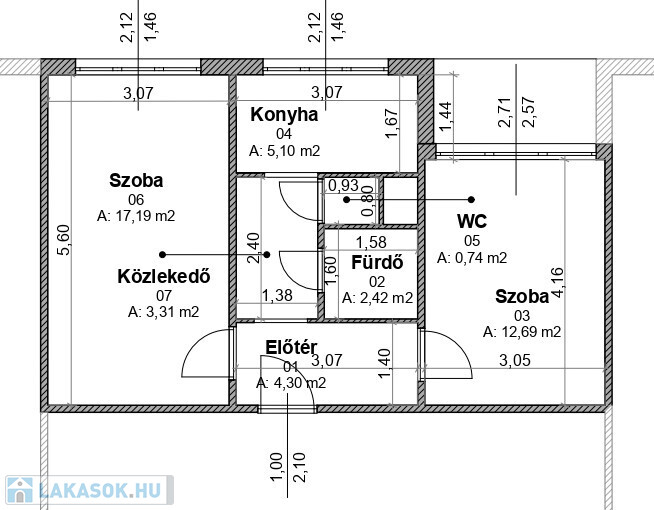 Az ingatlan a kedvelt elrendezésben található. Két külön bejáratú szoba. Közlekedő, fürdő wc-vel és konyha.