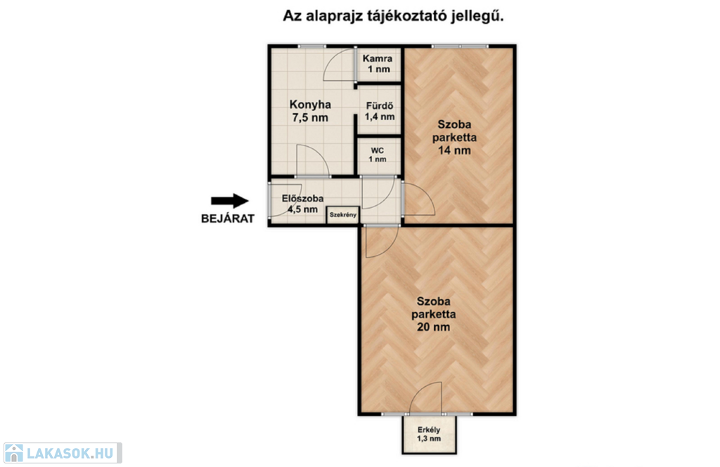 - Frissen polírozott fa parketta mindkét szobában, a többi helyiségben linóleum.