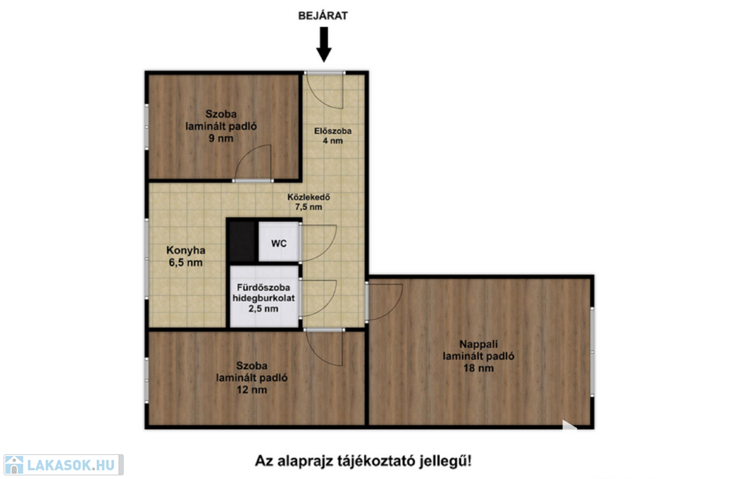 - laminált padló a szobákban, hidegburkolat a többi helyiségben,