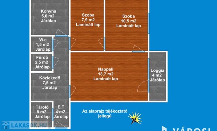 A lakás 1 db nappalival, 2 db hálószobával, 1 db fürdőszobával, külön Wc-vel, közlekedővel, előtérrel, és tárolóval, erkéllyel rendelkezik. Az ingatlan elhelyezkedésre, kialakítása miatt rendkívül sokrétű a felhasználása - akár lakás, vagy befektetési célra -, amely maximálisan kiemeli ezt az ingatlant az átlagos lakások sorából és egyedülálló választássá teszi azt.