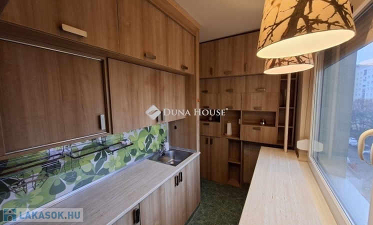 - világos, jó fényviszonyokkal rendelkező konyha van, mely plafonig érő, beépített szekrénysorral rendelkezik