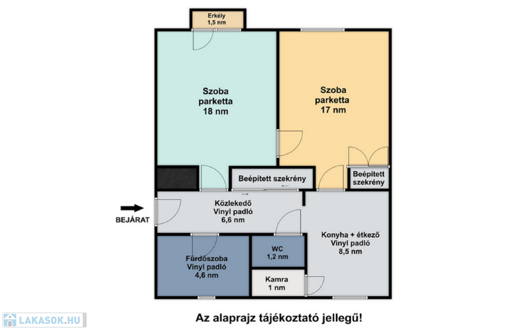 A lakás két külön bejáratú tágas szobából áll (az egyikhez tartozik egy kisebb erkély is), így ideális befektetés vagy kényelmes otthon is lehet pároknak, családoknak illetve diákoknak. A fürdőszoba kádas és a WC külön helyiségben található, a konyha + étkező még egy kis kamrával egészül ki.