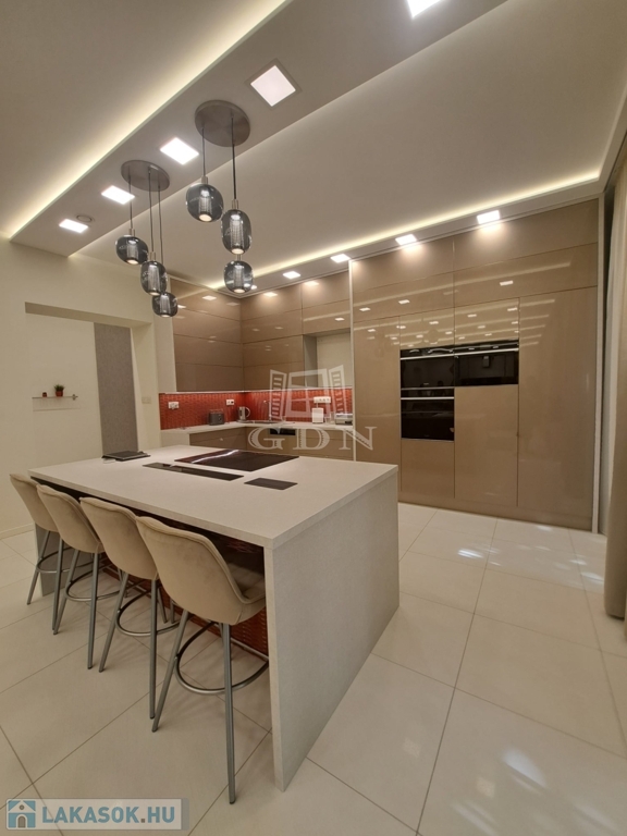 Az amerikai konyhás nappali egyedi készítésű konyhabútorral, teljes körűen, felsőkategóriás gépekkel felszerelt – a funkcionalitás és a design tökéletes egyensúlya.