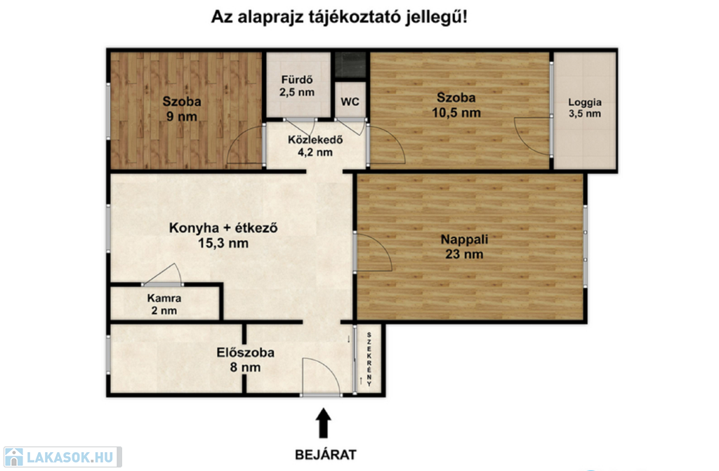 A lakás három különnyíló szobával rendelkezik, a konyha és étkező egy légtérben helyezkedik el, melyhez kamra is tartozik. A kihelyezett előtér akár gardróbként is funkcionálhat, a beépített szekrények pedig bőséges tárolási lehetőséget biztosítanak.