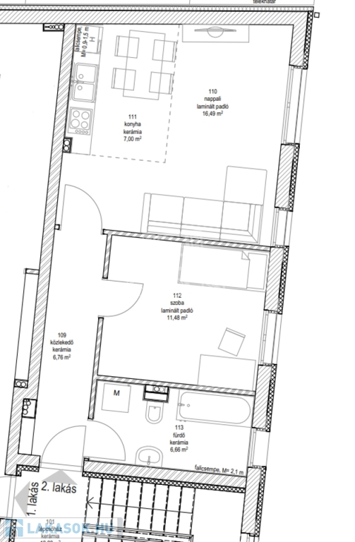 A társasház első emeltén található 48 m2-es lakás elrendezése: