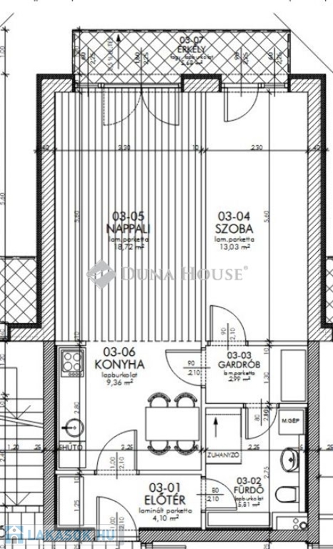 Helyiségei: - nappali+konyha, - szoba, - gardrób, - fürdő+WC, - előtér, - erkély