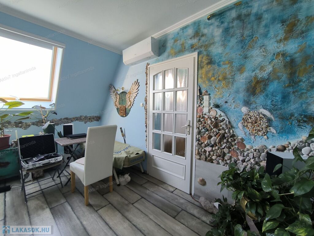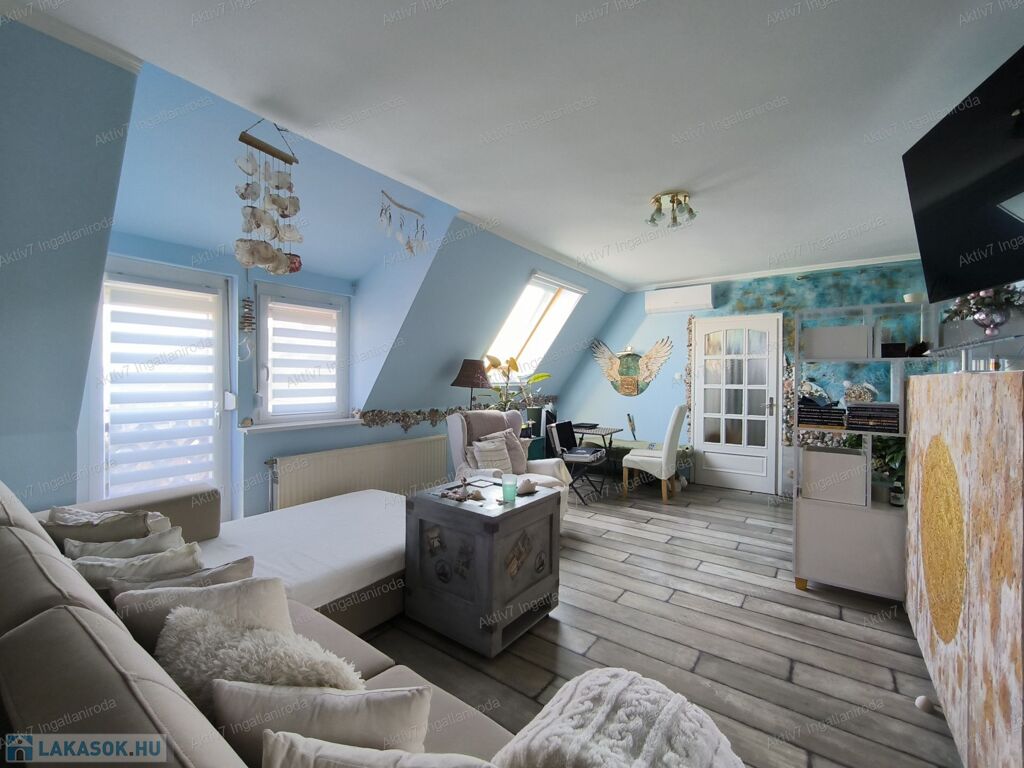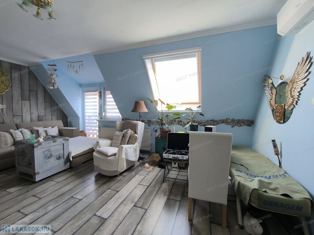 A lakás egy 2002-ben épült 17 lakásos társasház 4. emeletén, a tetőtérben található.