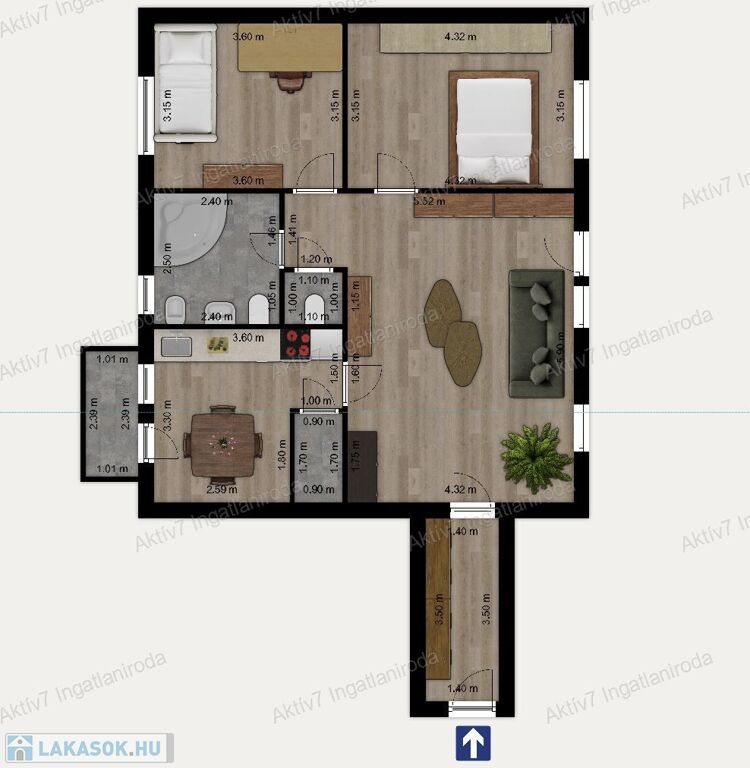 A lakás központi része a nappali, innen közelíthető meg az étkező/konyha a hálószobák és a vizesblokkok.