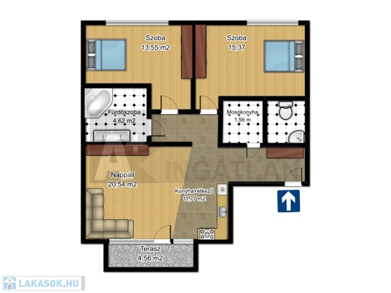 Amerikai konyhás nappali + 2 szoba , Erkély: 4,56 m2
