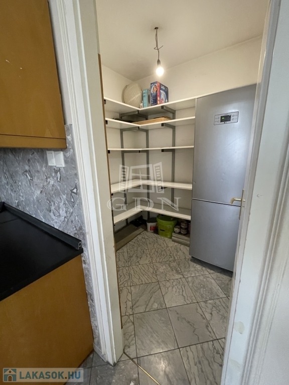 A lakásban nagyon sok tárolási lehetőség van, hiszen egy nagy méretű spájz, gardrob helyiség és több beépített szekrény is található.