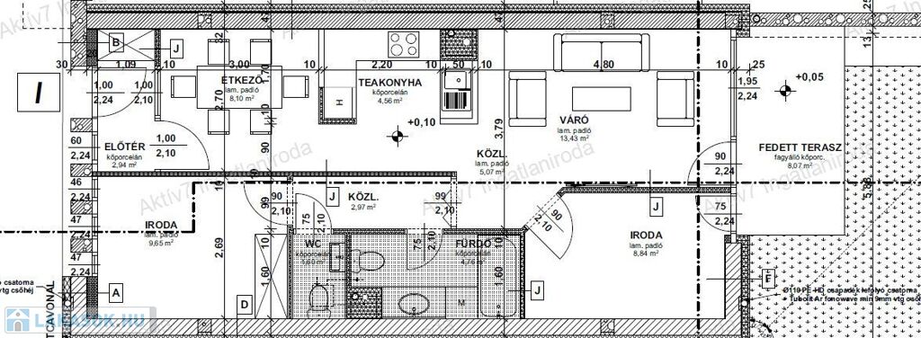 A szóban forgó földszinti lakás az alaprajzon irodaként szerepel, a helyiségek is ennek megfelelően vannak elnevezve. 62 m2 területű, ha lakásként funkcionál akkor amerikai konyha nappali +2 hálószobás , fürdőszoba- WC-vel , WC külön helyiségben is , 8 m2 fedett terasz és 25 m2 kert rész tartozik hozzá. (a fotók között található alaprajz szerint). Ennek a lakásnak a megvásárlásához a 3%-os otthon start hitel és a CSOK + hitel nem vehető igénybe.