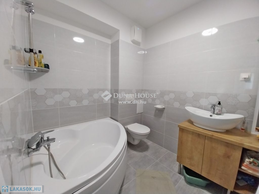 A tágas fürdőkbe sarokkád illetve zuhanykabin került beépítésre, a mellékhelyiség nem szeparált.