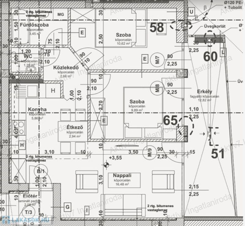 A szóban forgó lakás első emeleti, 53 m2 területű, amerikai konyha nappali +2 hálószobás, a hozzá tartozó12,82 m2 terasszal (a fotók között található alaprajz szerint).