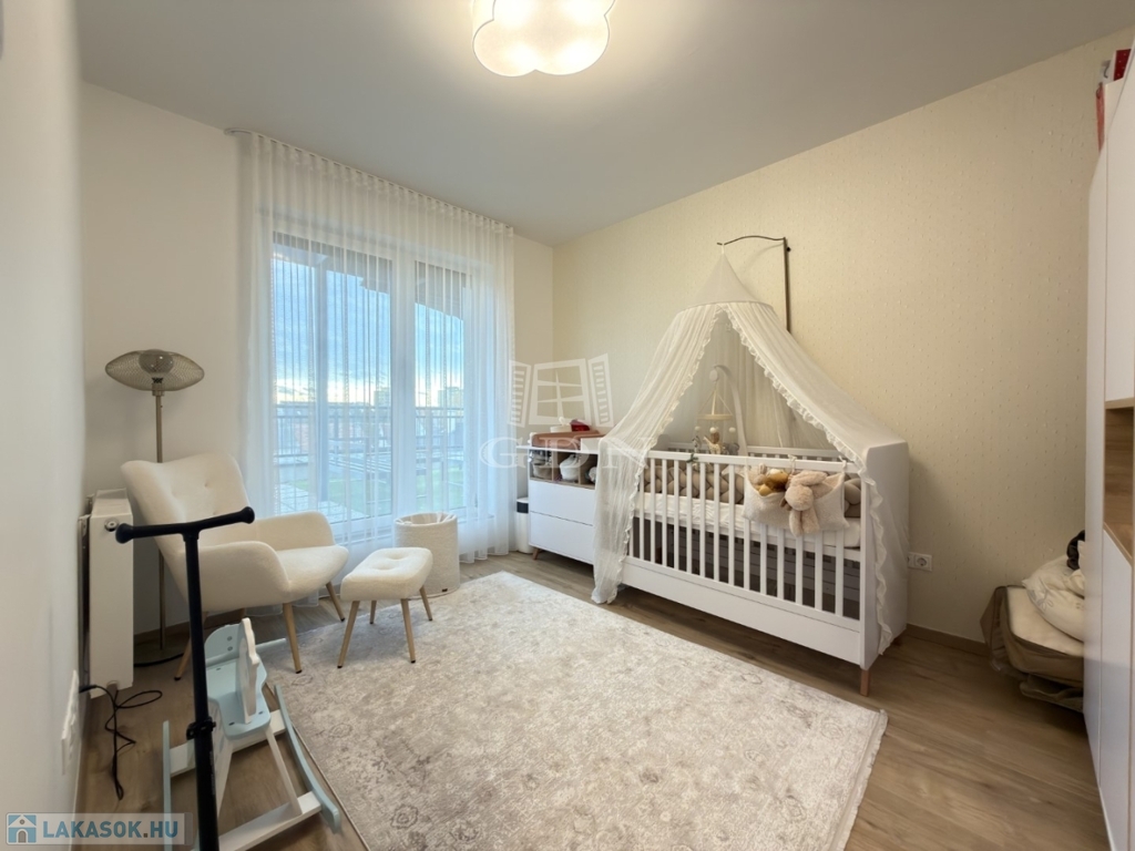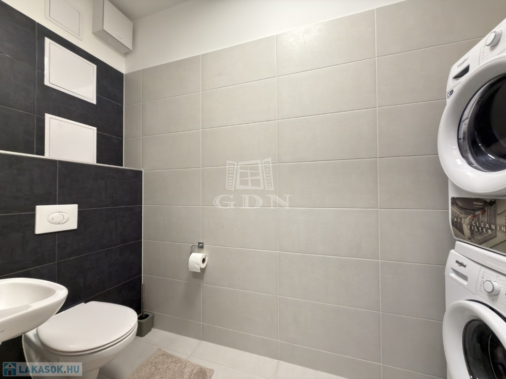 A 80,47 m²-es lakás amerikai konyhás nappaliból, valamint két különálló, szeparált szobából áll. A háztartási helyiségben külön WC kapott helyet, a fürdőszoba pedig káddal és további WC-vel felszerelt. A lakás nyugati és déli irányból is rendkívül világos, DNy-i tájolásának köszönhetően egész nap természetes fényben fürdik.
