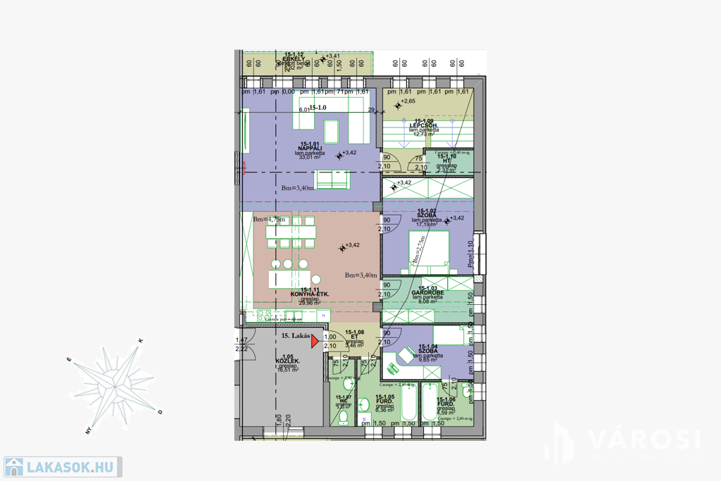 Az emeleten levő 130,73 négyzetméteres 15. lakás a következő helyiségekkel kerül kivitelezésre: nappali, 2 szoba, gardróbszoba, konyha, 2 fürdőszoba, WC, 37 négyzetméteres terasz és egy a lakásból megközelíthető 35,88 négyzetméteres gépkocsitároló. Ára: 175 469 700 Ft.