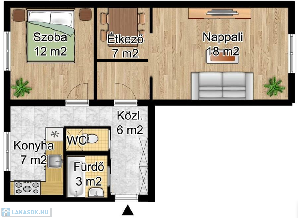 Az 53 m²-es alapterület jól kihasználható, a lakás elrendezése: 2 szoba és hall, konyha, fürdőszoba és egy külön WC alkotják a helyiségeket.