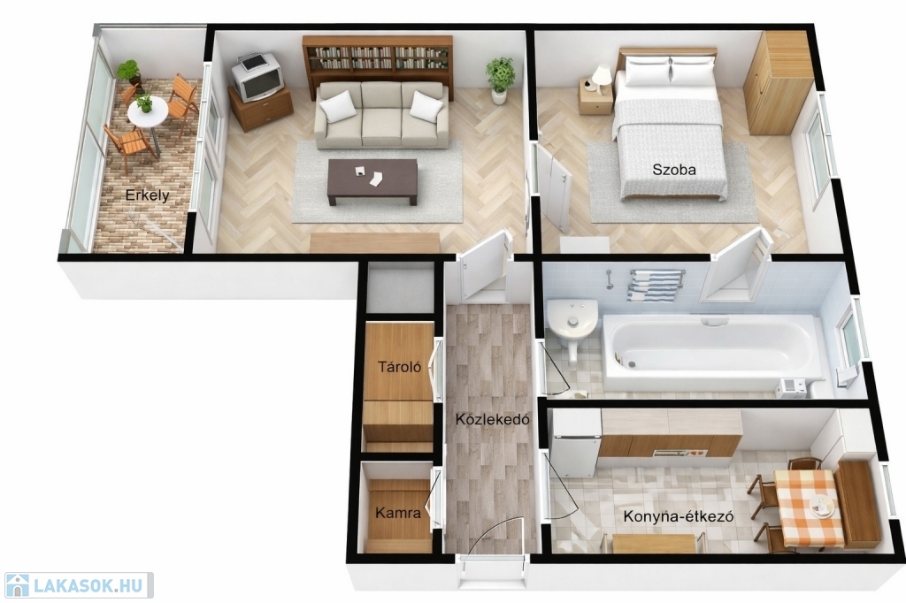 A lakás elrendezése kiváló: a két szobán kívül egy tágas előszoba-közlekedő, tároló, kamra, konyha-étkező, valamint fürdőszoba WC-vel is helyet kapott. Az erkélyről és az ablakokból minden irányba szép panoráma nyílik a városra.