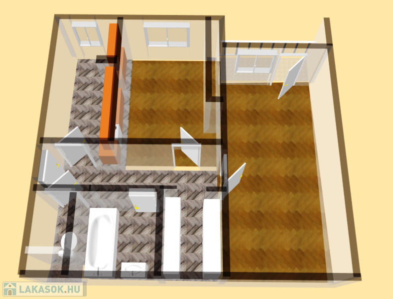 A lakás elrendezése: nappali + 1 hálószoba, konyha, fürdőszoba, külön mellékhelyiség, méretes gardrób, közlekedő és egy tágas erkély.