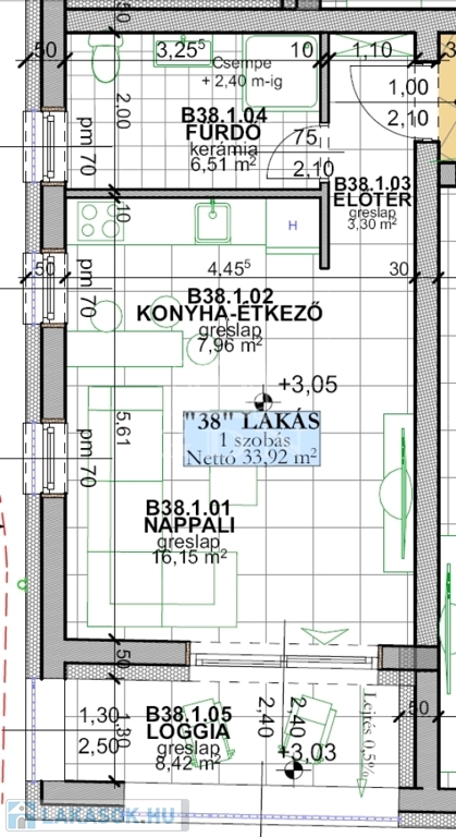 Elrendezés: konyha + étkező - nappali, előtér, fürdő/wc egy helyiségben, terasz 8,42nm