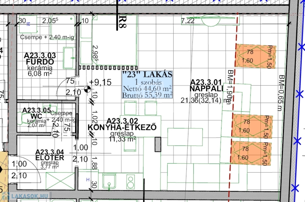 Elrendezés: konyha + étkező – nappali, előtér, fürdő/wc külön helyiségben