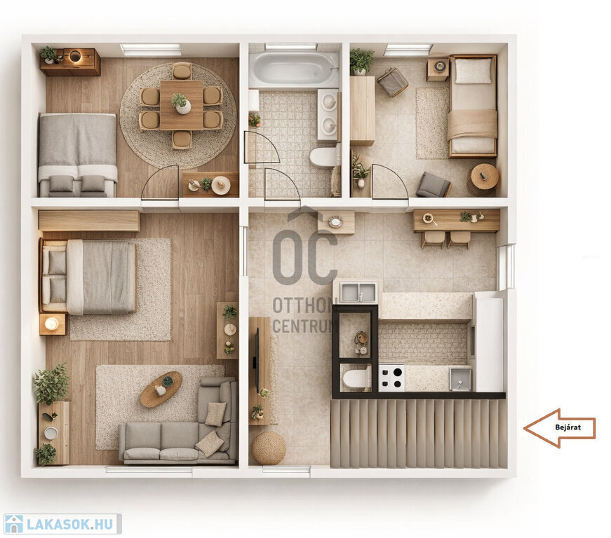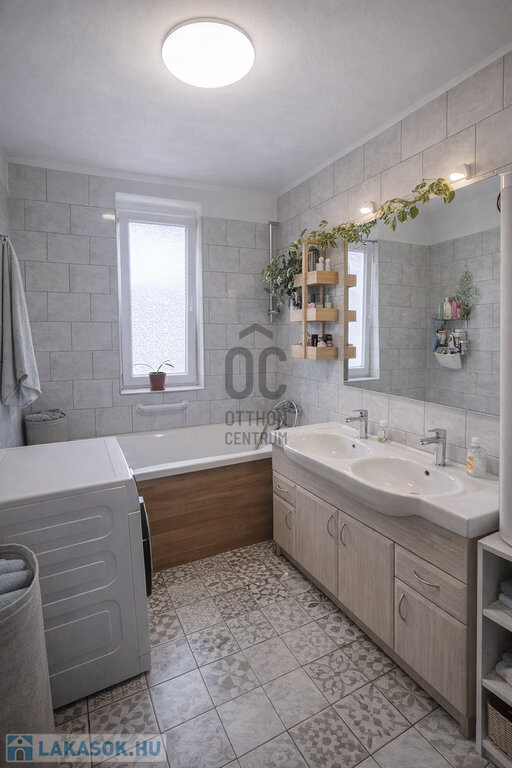 A praktikus elrendezés (nappali + 2 hálószoba, külön WC, tágas fürdő dupla mosdóval) kényelmes, jól élhető otthont biztosít.