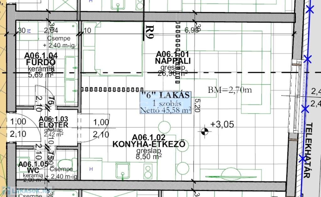 Elrendezés: konyha + étkező – nappali, előtér, gardrób, fürdő, wc külön helyiségben