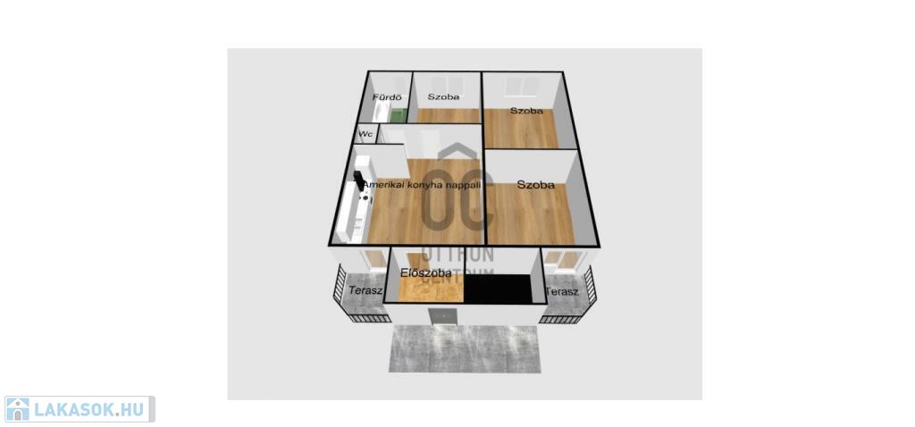 A három szobán kívül, a 100m2-en a lakás magában foglal egy hatalmas amerikaikonyha-nappalit, egy tágas előszobát, egy fürdőszobát, egy mellékhelyiséget és kettő erkélyt.
