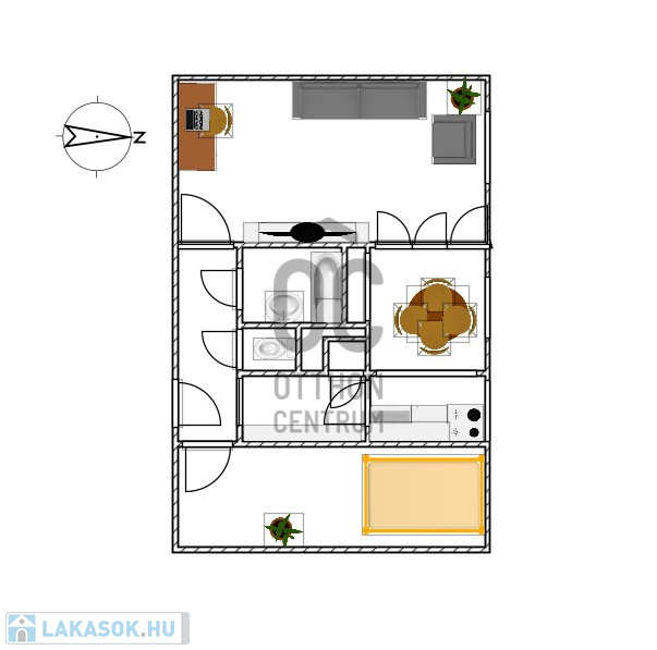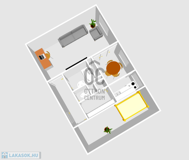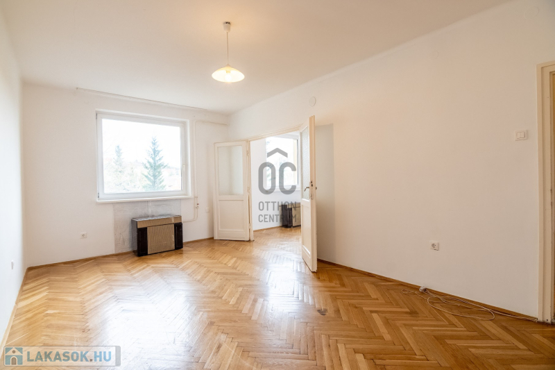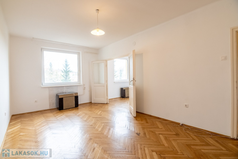 Az ingatlan elrendezése kényelmes és jól használható: tágas, 20 m²-es nappali, 12,85 m²-es hálószoba, mindkét helyiség minőségi parkettával burkolt.