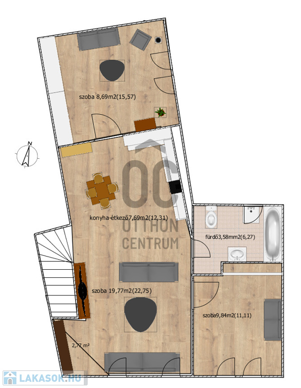 - A nappali a konyhával és az ebédlővel egy légtérben helyezkedik el