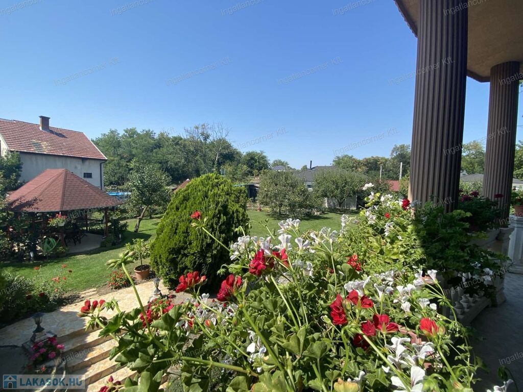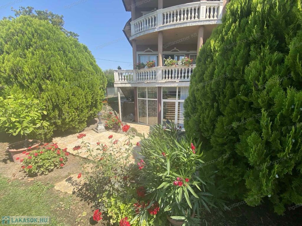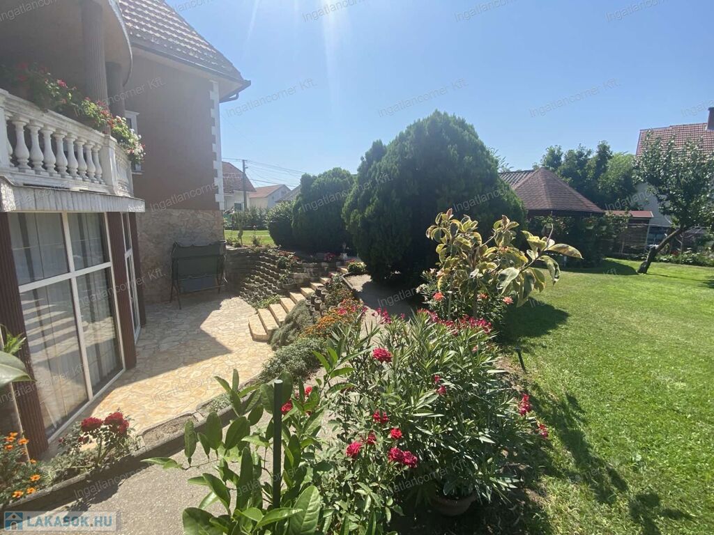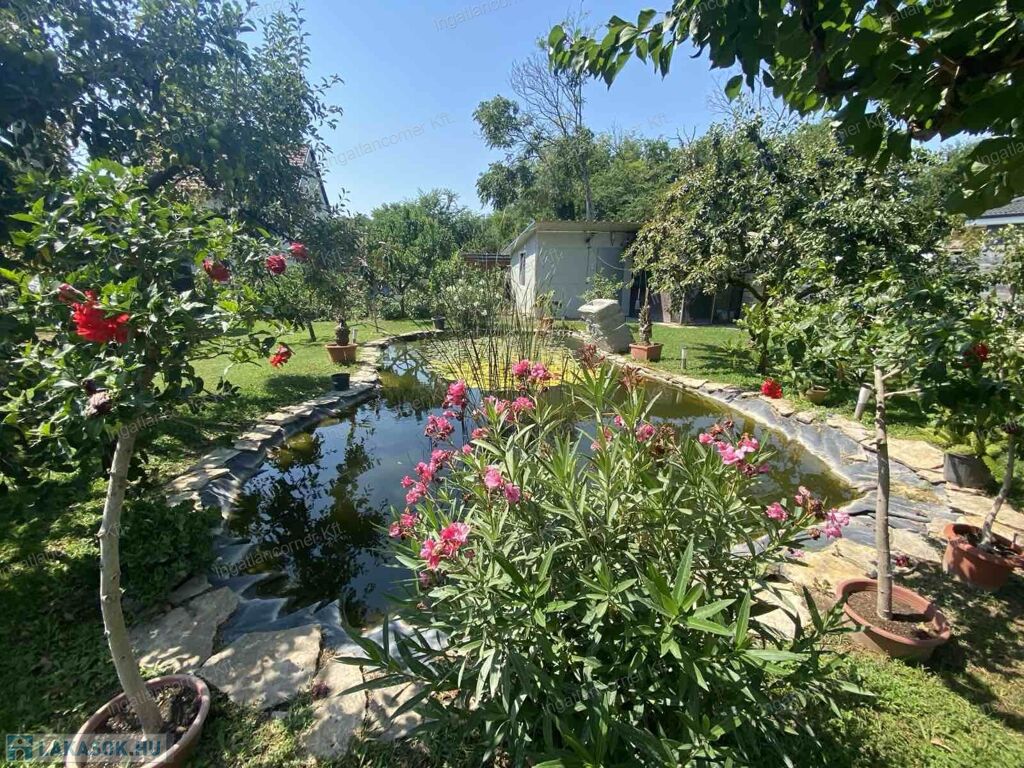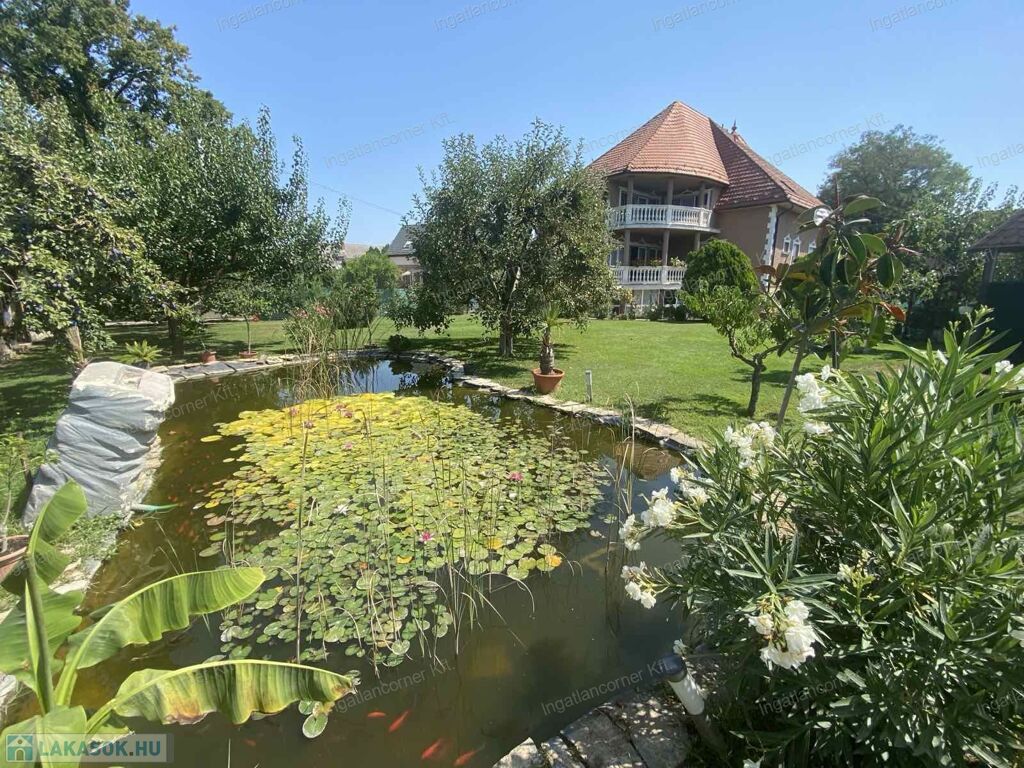 A hatalmas udvar gyönyörűen parkosított, termő gyümölcsfákkal beültetett. ( sárgabarack, őszibarack, szilva, szőlő stb)egy nagy kerti tó ékesíti a hátsó részt, tele szebbnél szebb halakkal.