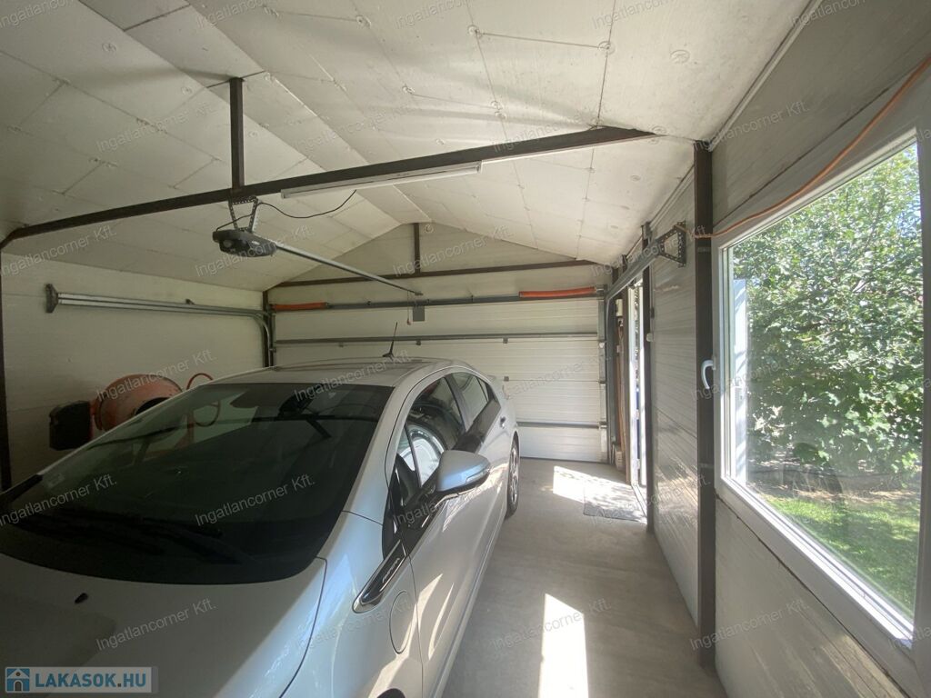 A kert végében egy dupla garázs, szekcionált , elektromos ajtóval, hatalmas ablakokkal.Hozzáépítve egy télikert, ahol a kényesebb növények kitelelnek.