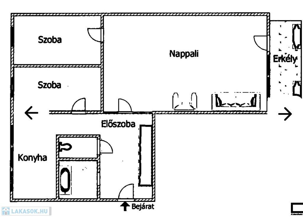 Elosztása: közlekedő/előtér 5,61 m2, nappali szoba 26 m2, félszoba 8,51 m2, félszoba 8,51 m2 konyha/étkező 8,65 m2, fürdőszoba 3,51 m2, toalett 1 m2, erkély 3 m2