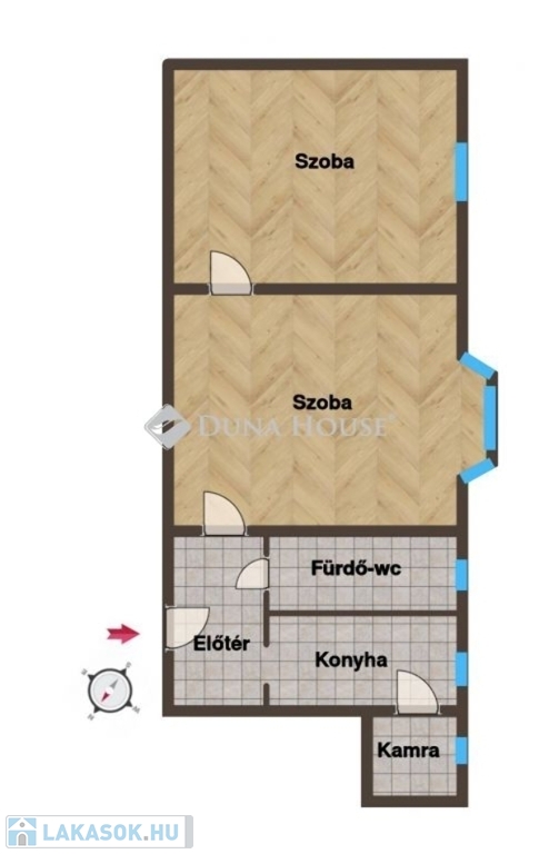 A lakás hőszigetelt, 2 rétegű fa ablakokkal rendelkezik, rovarhálóval és redőnnyel szerelve.