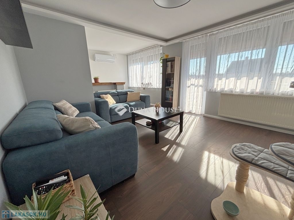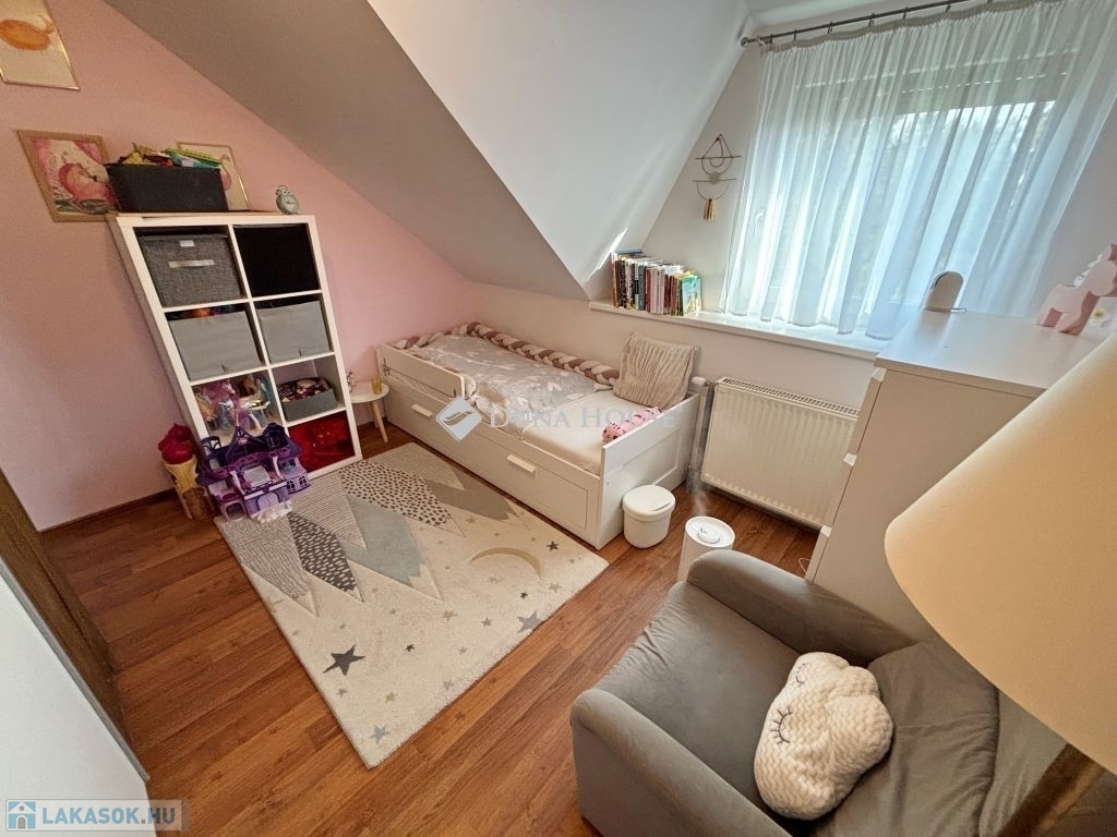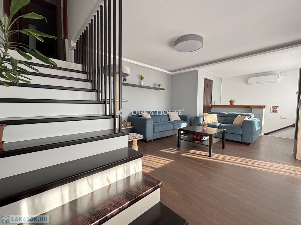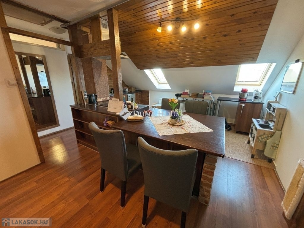 Szombathely kámoni városrészén jó állapotú, nettó 90 m2 alapterületű lakás eladó. Az ingatlan egy kétlakásos társasház utcafronti oldalára nyílik, ahol egy kis udvarrész is tartozik hozzá. A térkövezett udvaron parkolni is lehet egy autóval, további egy gépkocsival a kapu előtti hídon. A lakás nagyobb része két szintre osztott, az emeleten egy tágas világos nappali fedett terasszal és egy mellékhelyiség van kialakítva, a tetőtérben kapott helyet a két hálószoba, a konyha étkezővel, egy fürdő és egy kis háztartási helyiség wc-el. A földszinti bejárati részen van még egy kis tároló és az előszoba. Az ingatlan rendezett karbantartott állapotú, az elmúlt években megújult többek között a nappali, és a nyílászárók is korszerűsítve lettek, az ablakok redőnnyel és rovarhálóval is fel vannak szerelve. A tetőtéri ablakokat tavaly cserélték korszerűbbre.